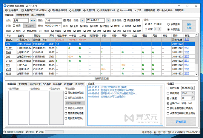 12306Bypass 软件完全免费,全程自动抢票,可以自动抢后补以及余票捡漏,支持多天、多车次、多乘客选座,支持多站查询,可以自动识别验证码,提供 QQ 通知、邮件通知、微信通知等功能。总之功能很丰富,是最好的抢票软件之一,也是值得推荐的首选。