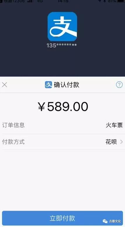 12、出现确认支付画面,点击立即付款,根据提示进行支付。支付完成后,将会出现付款成功的通知。至此购票完成。