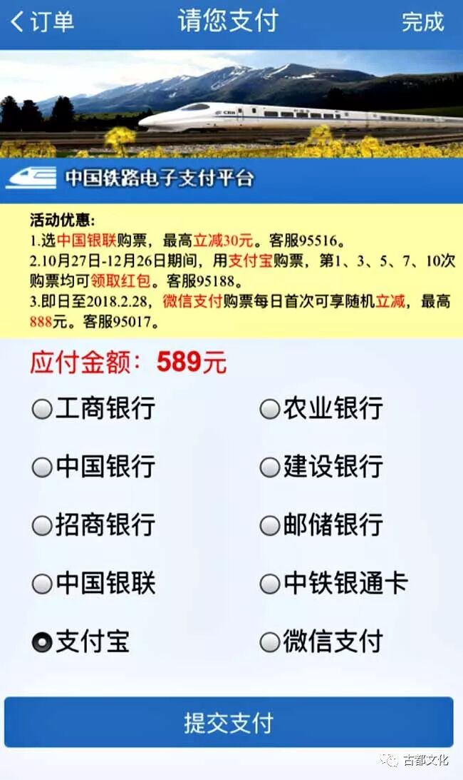 11、选择支付方式。从2007年11月23号开始,微信支付也正式接入12306购票平台,为我们提供了更多的支付选项。图中选择支付宝支付,然后点击下方的提交支付。