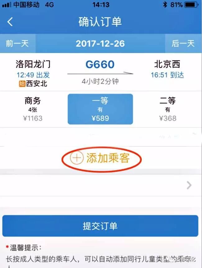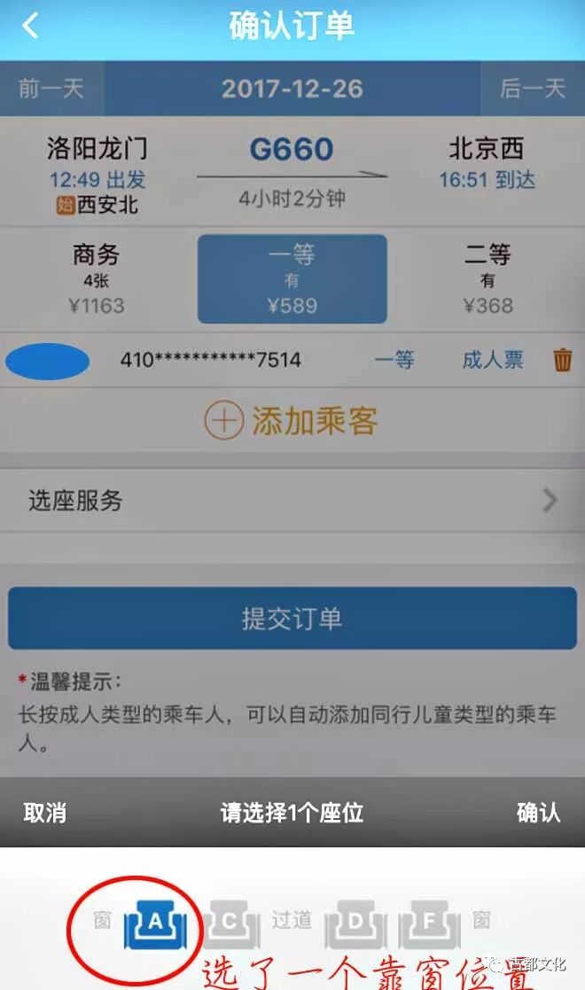 3、在确认订单页面,选择座位级别(图中选的是一等座),然后点击添加乘客。