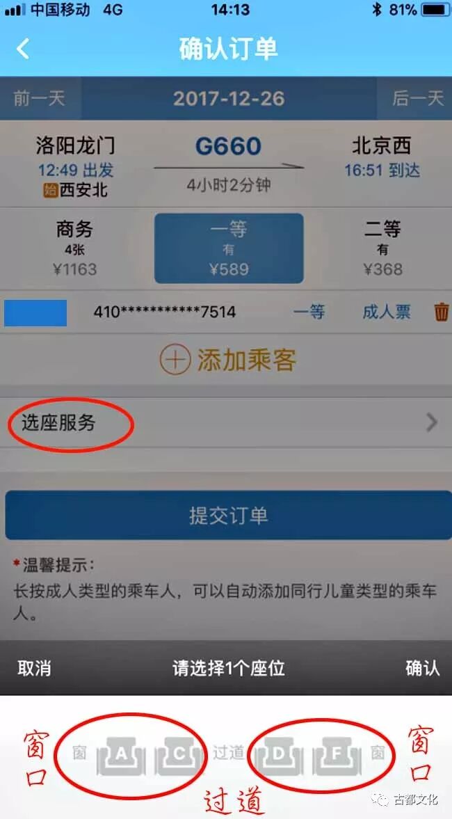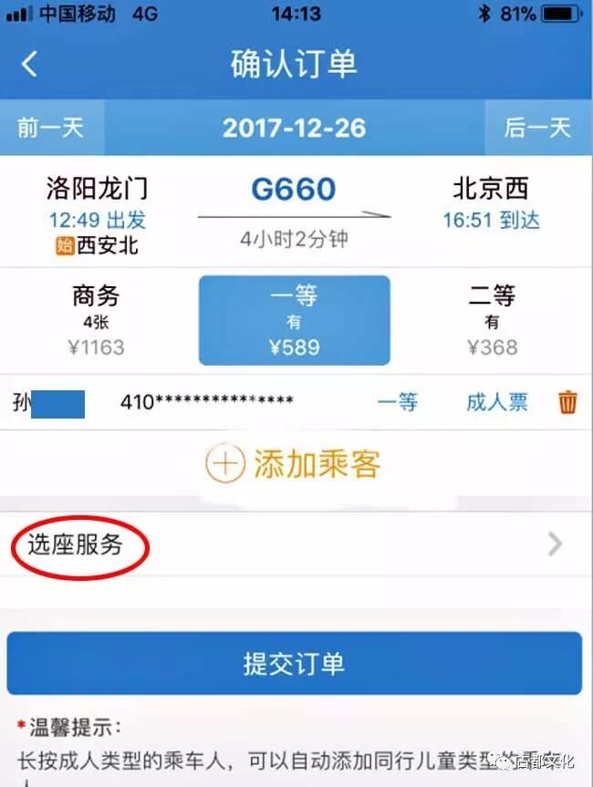 5、点击选座服务,这是关键的一步。如果直接点击提交订单,将不会出现选座菜单,而由系统自动分配座位。