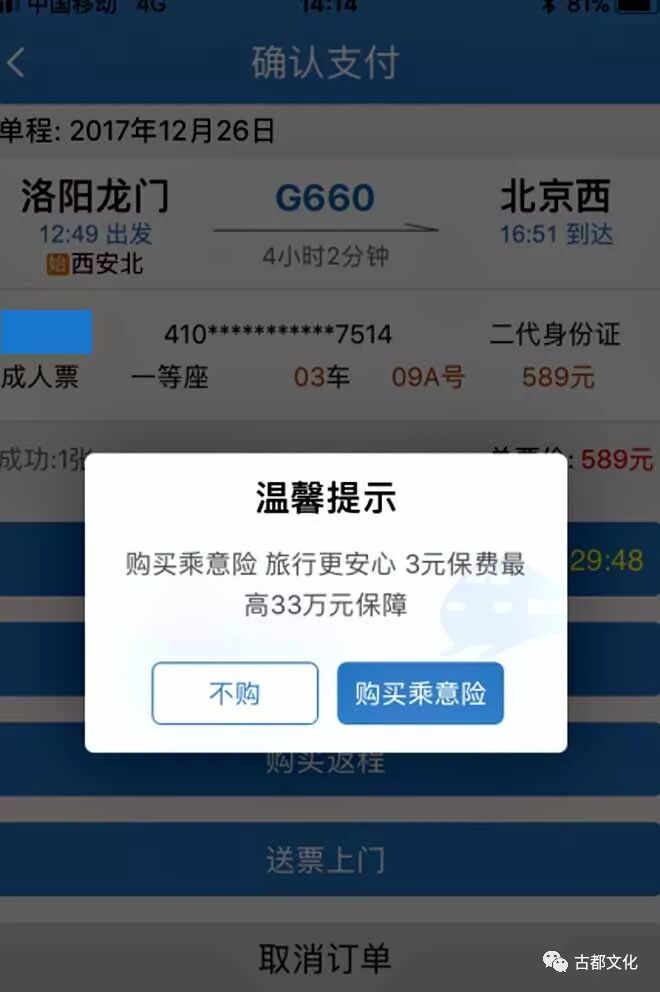 8、点击确定后,出现了是否购买乘车意外险的提示,根据需要决定是否购买。本人都是选择不购。