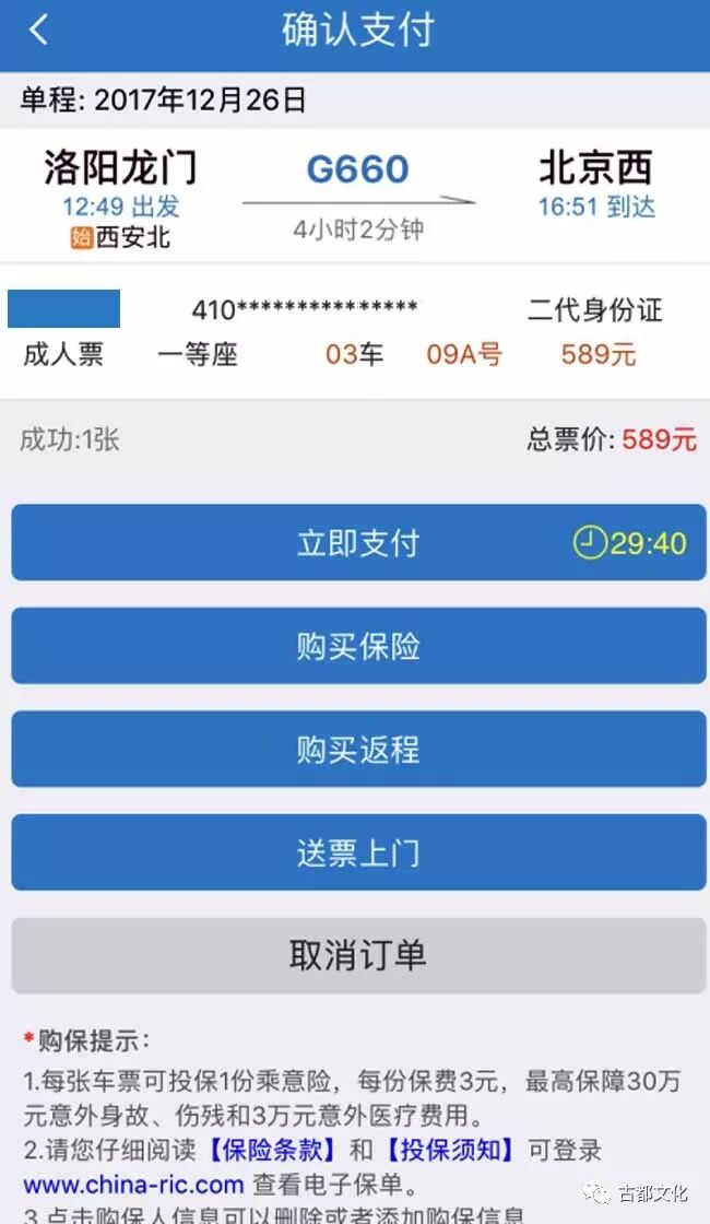 9、点击后出现支付画面。必须在30分钟之内完成支付,否则预定的座位将被收回。