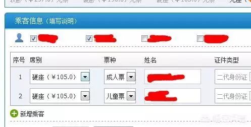 您只要在2个姓名前打上勾,就表示您同时购买两张一模一样的票,一张是成人票,一张是儿童票;打了勾之后,会出现以下界面: