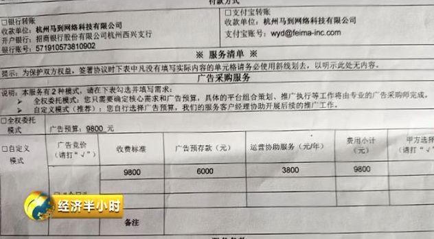 类似小吴遇到的这种情况并不是个例,杭州马到网络公司与巨量引擎公司的服务如出一辙。若卖家想要取得合作,要在杭州马到网络公司缴纳10万元的保证金,综合服务协议中还明确约定:广告预算首次充值金额为9800元。其中,广告预存款6000元,运营协助服务费3800元。而关于后期流量费用,保证金是否能退,工作人员支支吾吾。而合同小项中明文表示合同一旦签订,相关费用无法退还,只能消耗与使用。