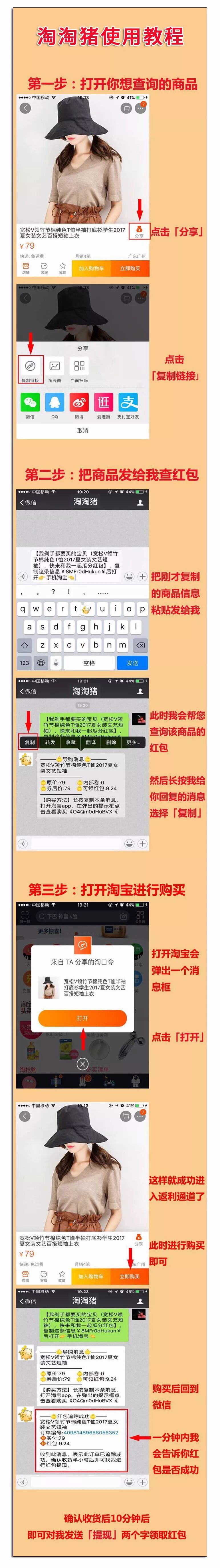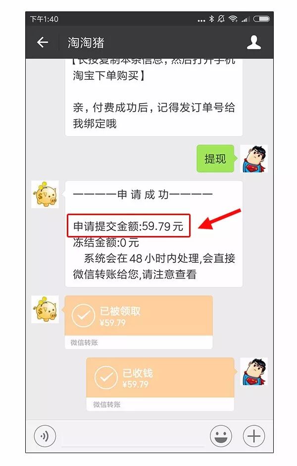 确认收货后发送提现两个字给淘淘猪就能提取你的返利了。