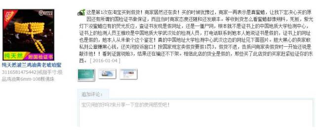 一位消费者在淘宝购买到一款蜜蜡手串,收货后经查验发现,随手串附带的珠宝鉴定证书为假证书,上面的检测人员姓名和检测中心网址以及公章都是伪造的。这位消费者在差评投诉2天内,此商品下架了,但几天后,商家把之前的销售记录全部清零重新上架。消费者举报给淘宝后,客服人员却仍称证据不足。
