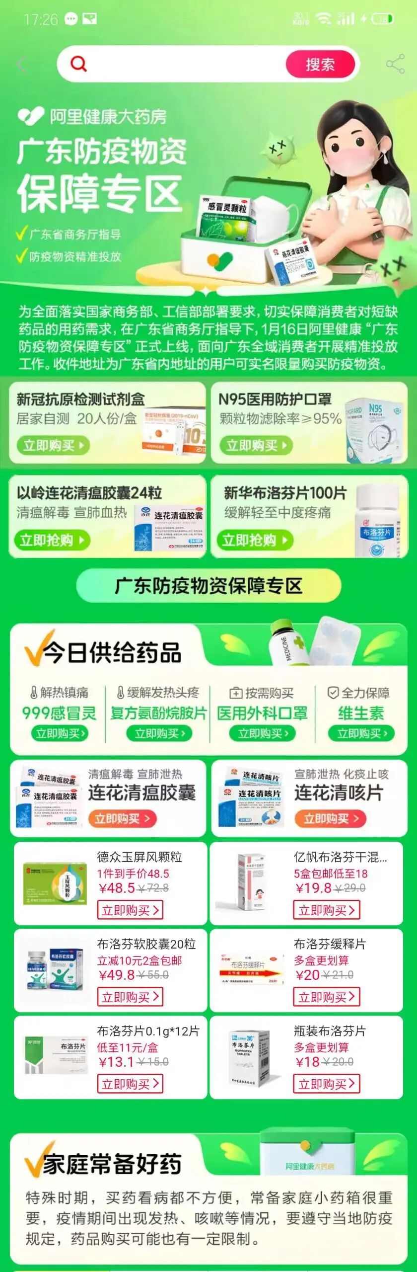 1月16日,在广东省商务厅指导下,阿里健康正式上线广东省专属防疫购药通道,面向广东居民精准投放退热药等紧缺抗疫物资,后期还将根据实际情况持续加大物资投入。广东居民可通过淘宝App搜索广东防疫或进入天猫买药直达广东防疫物资保障专区。进入专区后,广东居民可平价购买到布洛芬片、连花清瘟胶囊、N95医用防护口罩、抗原试剂盒等紧急抗疫物资,物资配送将通过防疫保供专属物流通道送货上门。