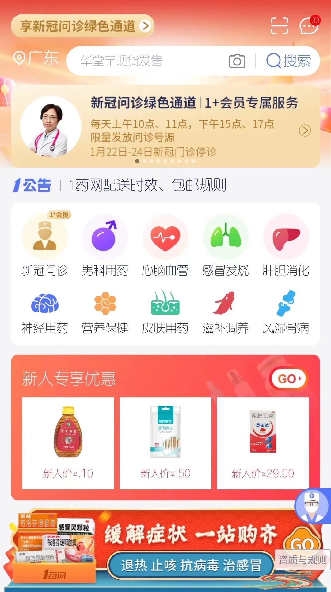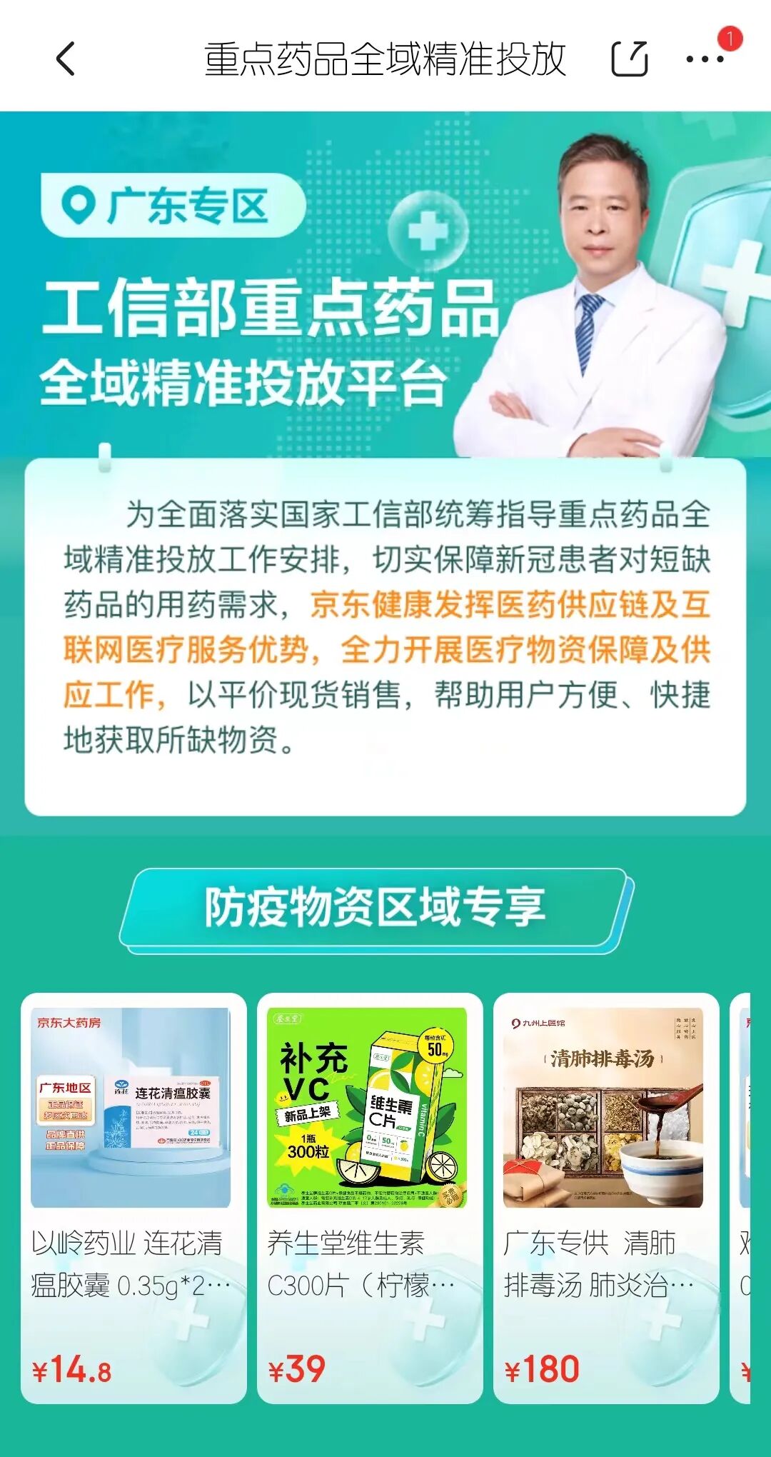 1月4日,京东健康上线重点药品全域精准投放平台广东专区,面向省内精准投放对乙酰氨基酚、连花清瘟、口罩和维生素C等药品和防疫物资。广东用户可登录京东APP,搜索广东防疫进入专区。完成实名认证,并上传核酸或抗原检测结果,或描述新冠病毒感染的相关症状,审核通过后,即可购买相关防疫药品和物资。