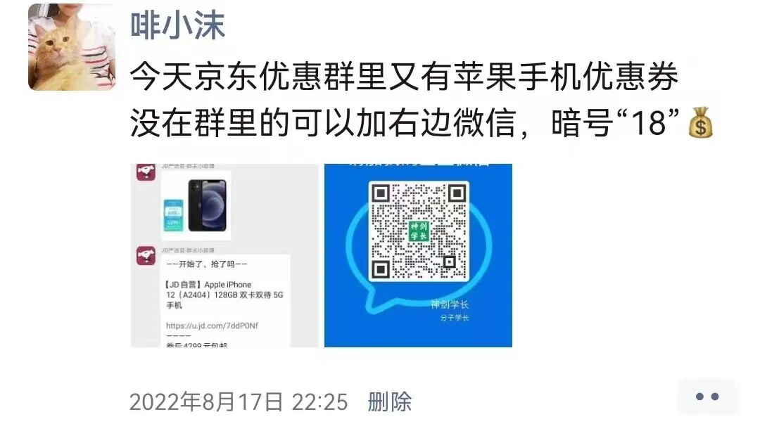 有时候,群里还能有苹果手机券。苹果搞活动非常少见,所以一旦有券,群里的京东小助理都会提前提醒大家的。