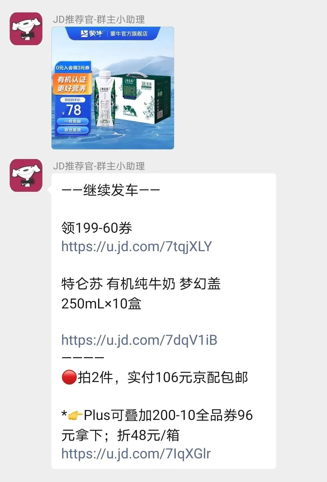 但是在群里下单,有券的时候,像下面这款特仑苏双有机认证的奶,囤两箱的话,折一盒才4块多。这个价格,我当然就愿意买有机的了。