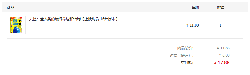 一般来说,旧书肯定比新书便宜的,同一本书在孔网卖的旧书相对便宜,这个就不用比较了。比如我买KK的《失控》,就没有去其他平台比价格,在孔夫子看到加运费不到18元,又是新版的,就直接买了。