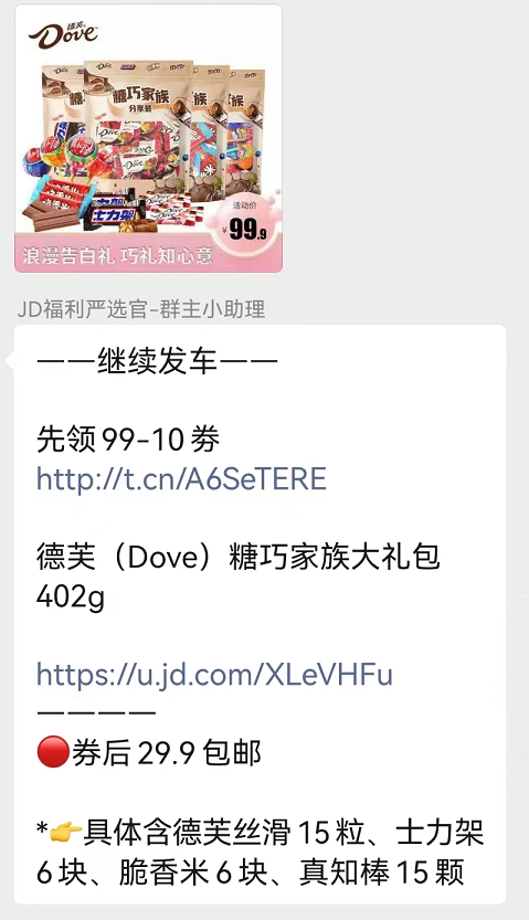 还有,下面这个德芙家族大礼包,券后29.9块,包含德芙丝滑15粒,士力架6块、脆香米6块、真知棒15颗。
