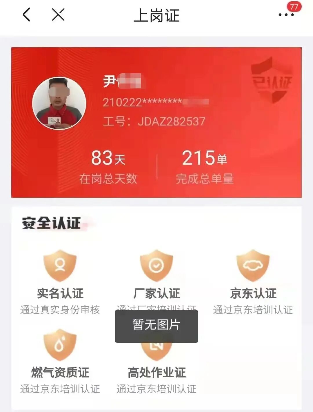 西西表示,在京东平台上,他可以查到尹师傅在岗工作已经83天,完成了215单工作,拥有安全认证,其中包括实名认证、厂家认证、京东认证、燃气资质证、高处作业证,可他点击这些证书,却显示暂无图片。