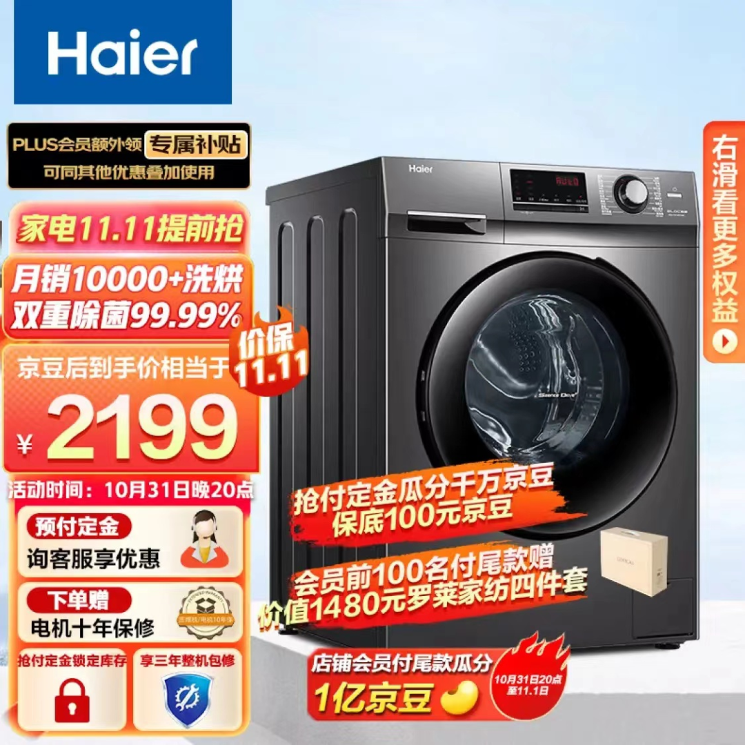 海尔滚筒洗衣机 全自动变频洗烘一体10公斤