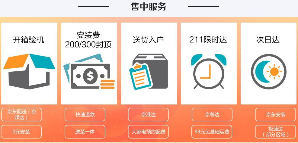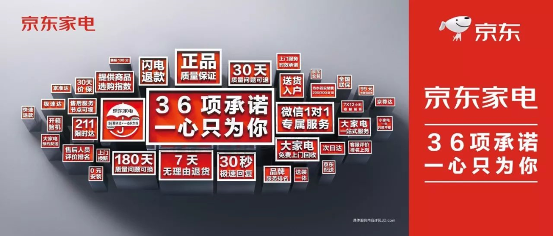 2018年,京东家电全面升级服务标准,包括特色服务、售前、售中、售后、增值服务在内的36项全流程家电消费服务承诺。