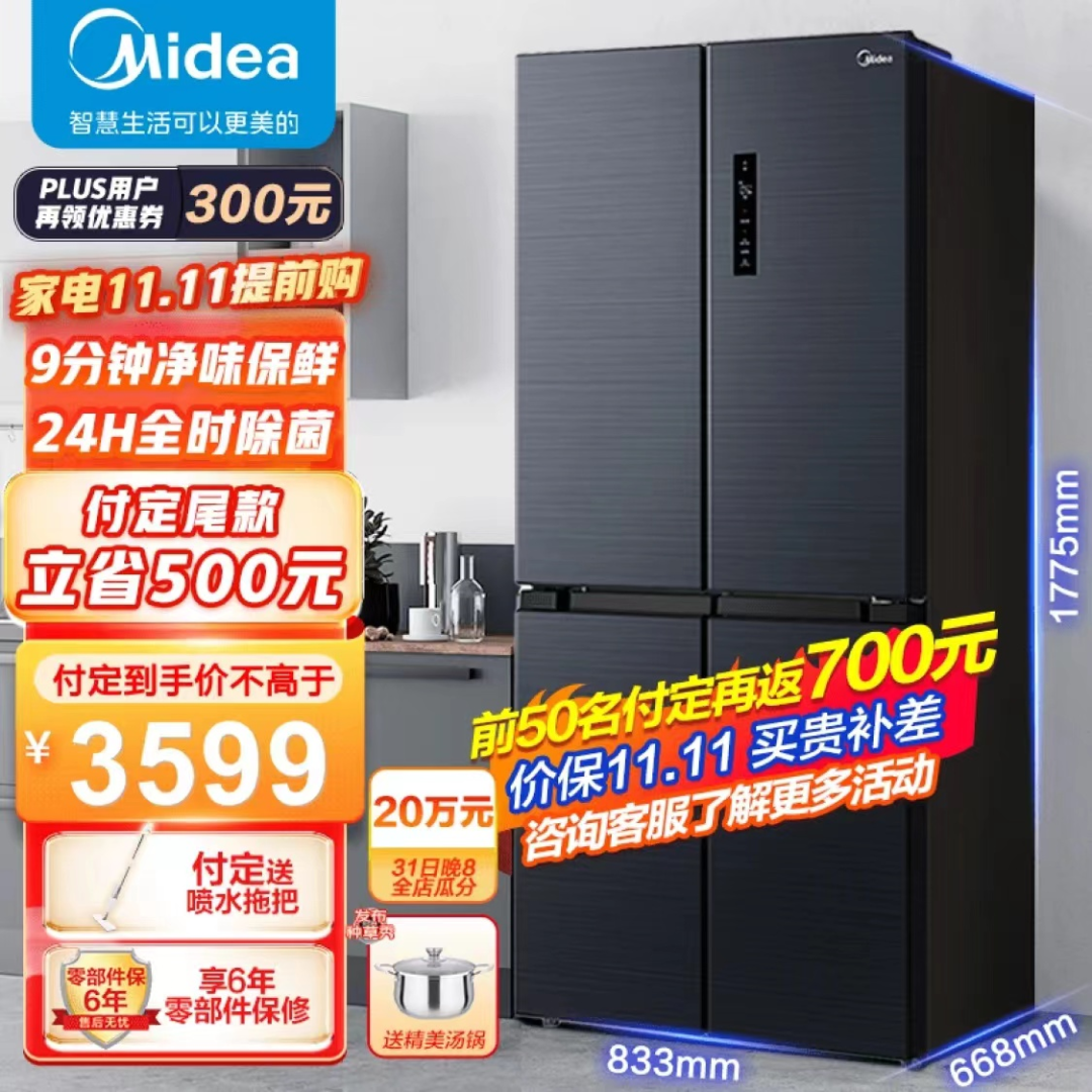 一级能效十字对开四门冰箱 ,20元定金,31日20点尾款,叠3000-300补贴券,预估价3299元。