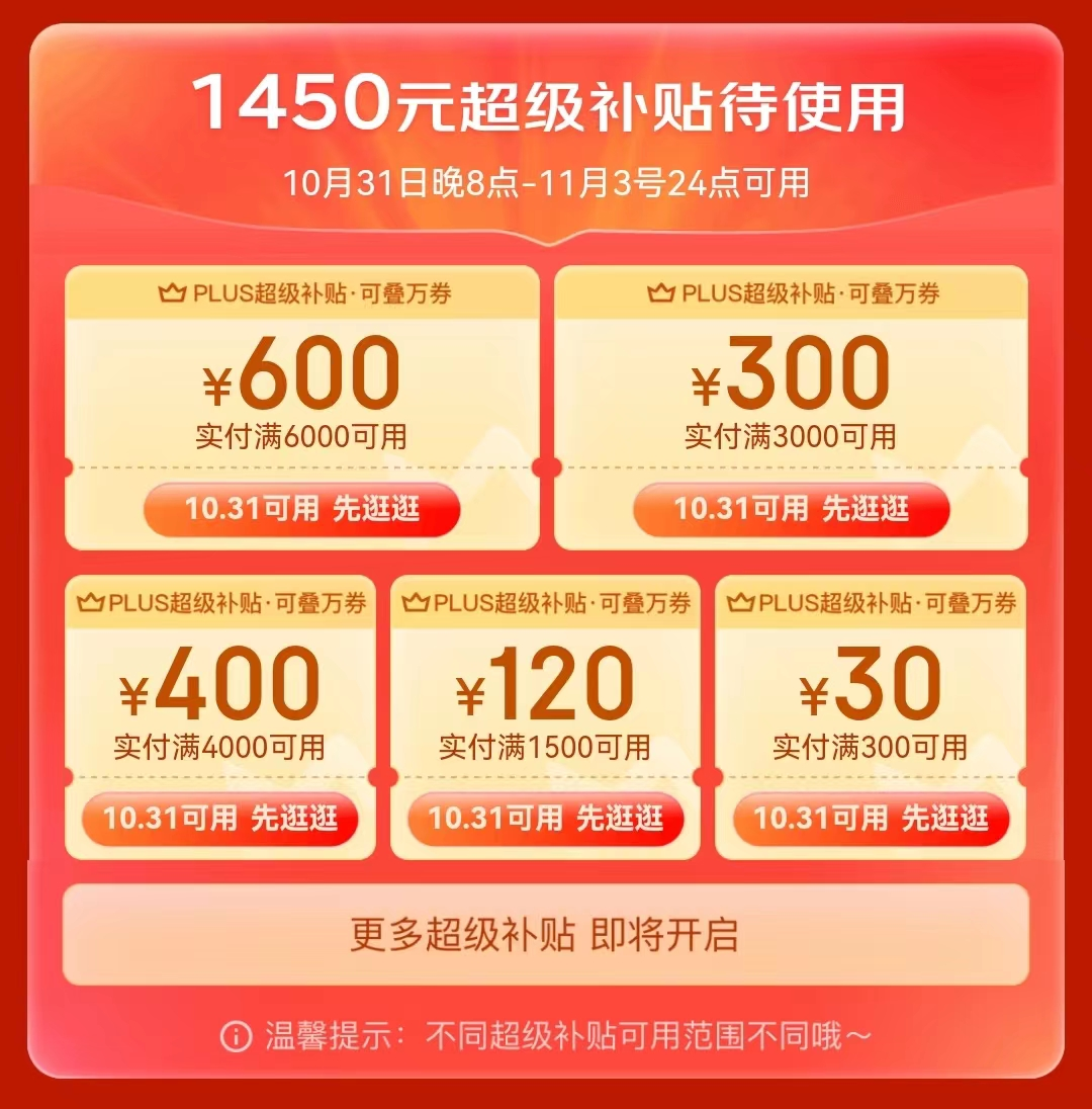 ② PLUS超级补贴:1450元超级补贴,可叠万券!10月31日晚8点-11月3日24点可用。