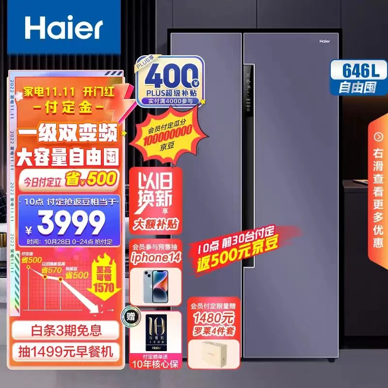 一级能效双开门电冰箱,付定享不高于4499元,20点起前50台付定返500元京豆。付尾款+晒单再送10年压机延保。