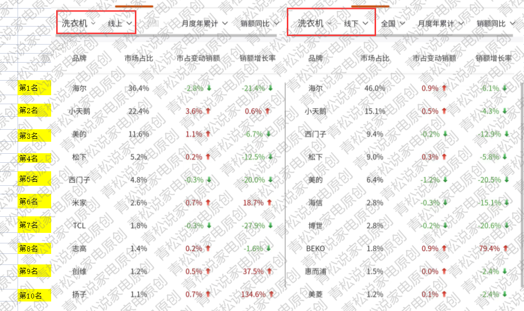 无论线上还是线下,海尔洗衣机都是第一,且远高于第二;