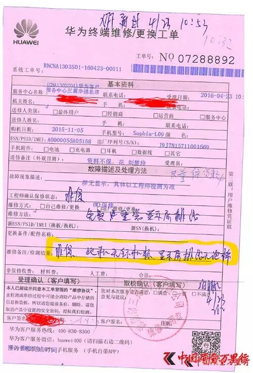 吴先生便拿到华为的售后服务中心去维修,经过维修人员处理后,手机恢复正常可以开启屏幕,但维修人员告诉他这个手机不是正品新机且缺少一个零件,极大可能是翻新机,并在维修单上注明非保,此机无封机标,显示屏排线无泡棉