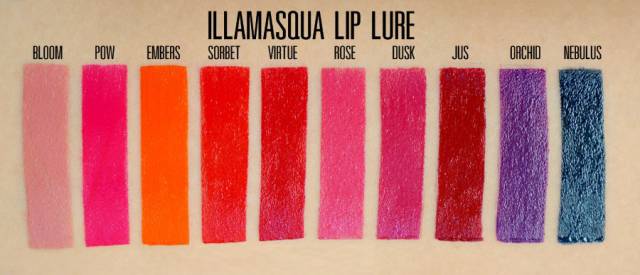 如果你没有这么高的彩妆要求,那么买口红一定不会出错!Illamasqua的口红色号简直多到让你试一天都不会重样。上一张典型的几种色号试色图,连不常见的蓝绿色也包括在内: