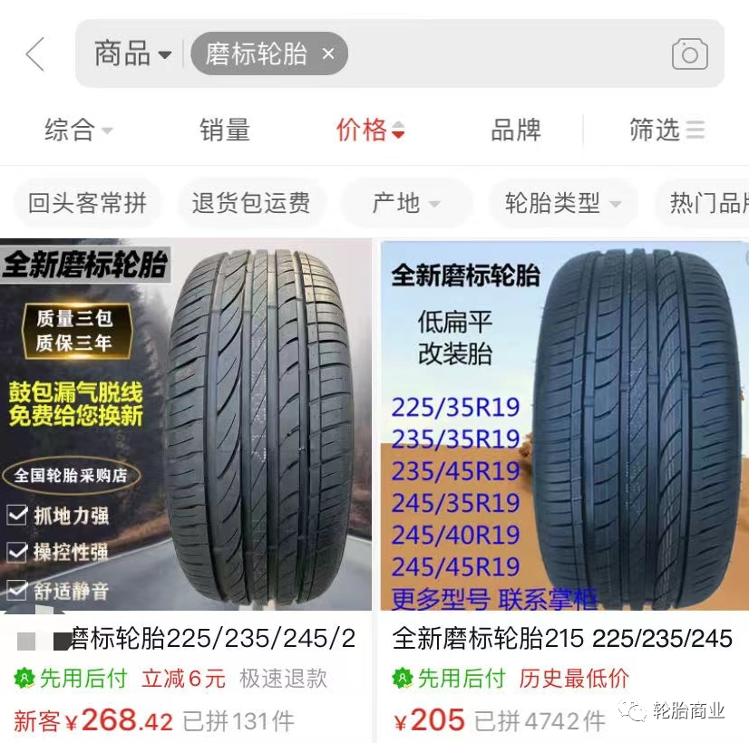 轮胎商业在某电商平台搜索磨标轮胎后,显示大量在售的轮胎。浏览发现,大部分商家在图片显著位置标明全新磨标轮胎。