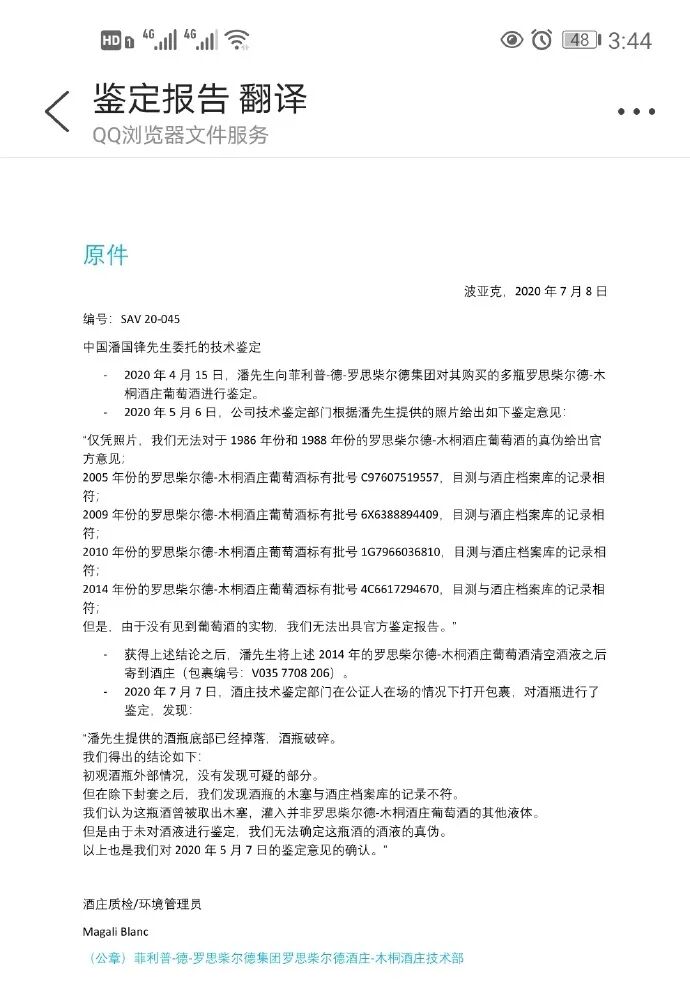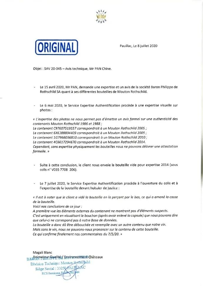 由于不满萨纳维和京东的回应,潘先生转而向木桐酒庄寻求帮助,并将其中2014年份的空瓶寄往酒庄进行鉴定。