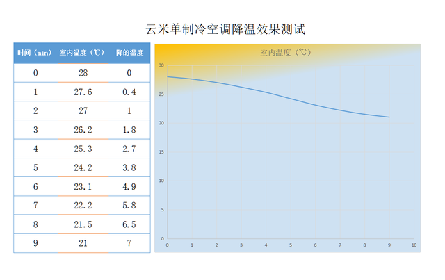 为了更好的量化制冷效果,我还做了个温度曲线,室内温度28°C,打开空调,调节温度到16°C,风量设置为AUTO。测试了一下,在刚打开空调的第9分钟时,出风口温度为19°C,噪音为47db,室内温度已经从28°C到了21°C,降了7度。