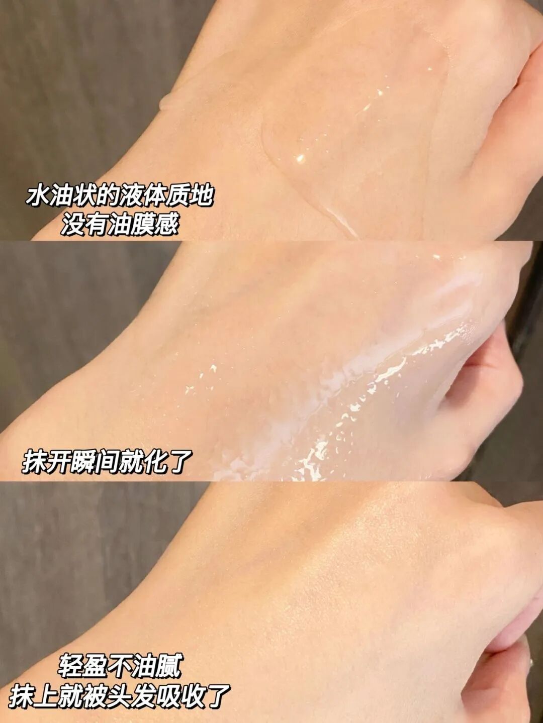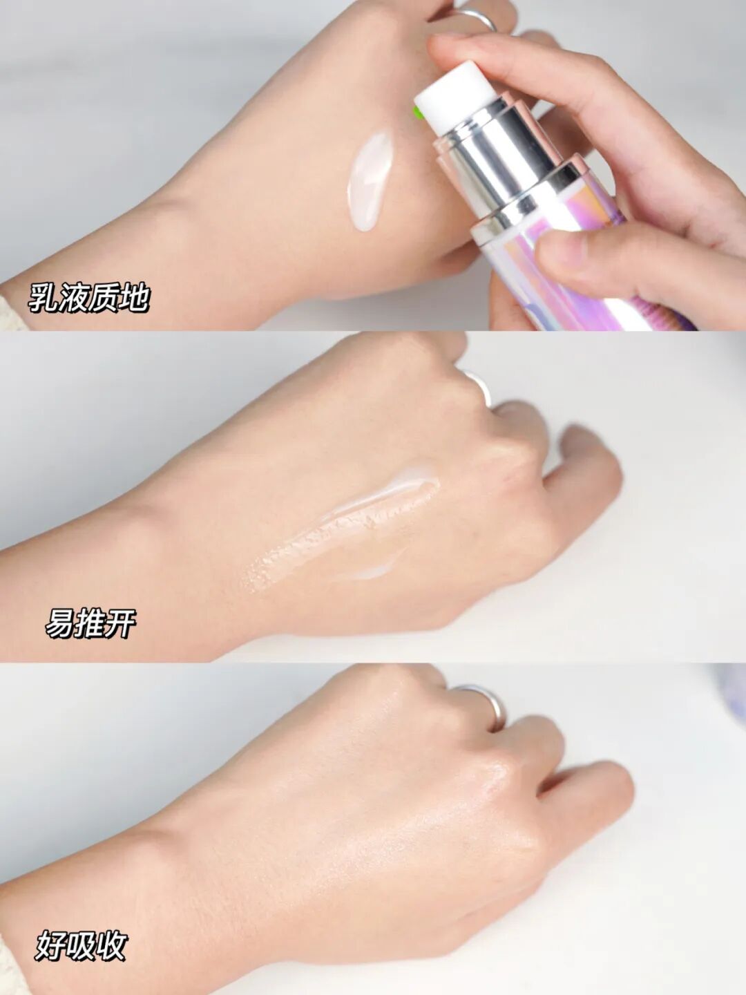 质地接近乳液巨轻薄,推开就很丝滑的feel,而且成膜超级快!涂完等待时间可以忽略不计,直接上粉底也ok子~
