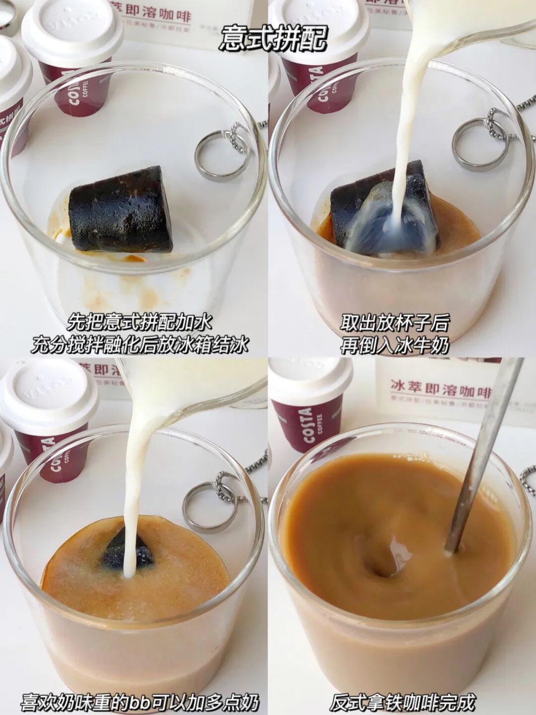 想让口感更丰富的,还还可以把它加水搅匀后放冰箱冻成小冰块,再加冰牛奶里面,轻松得到一杯自制拿铁!