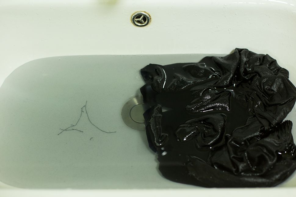 下水掉色严重!一池黑水不说,洗着洗着线头又洗出来几根!
