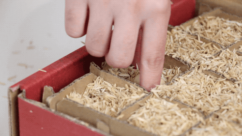 两层纸壳箱里才是真正的鸡蛋包装盒,打开后可以看到用卡纸分开的鸡蛋,用非常多的稻谷壳(起防震、透气、保持干燥的作用)填充,把鸡蛋保护得严严实实。