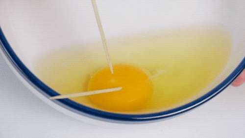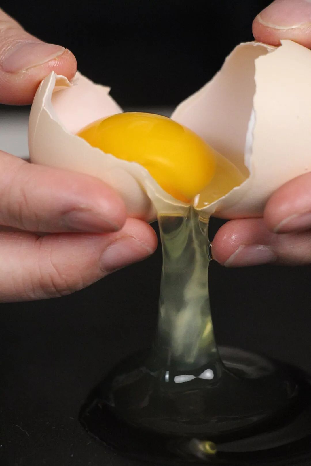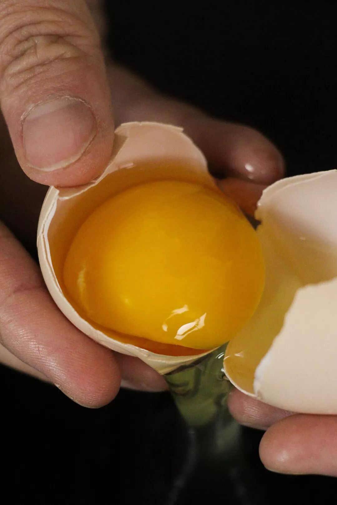 这里科普一个存放小知识。从我们拿出鸡蛋的动作,你也可以看到:储存鸡蛋时要尖头朝下、带气室的大头朝上,不要横放,以稳固蛋黄位置,避免蛋黄漂浮到上方,一打就散。
