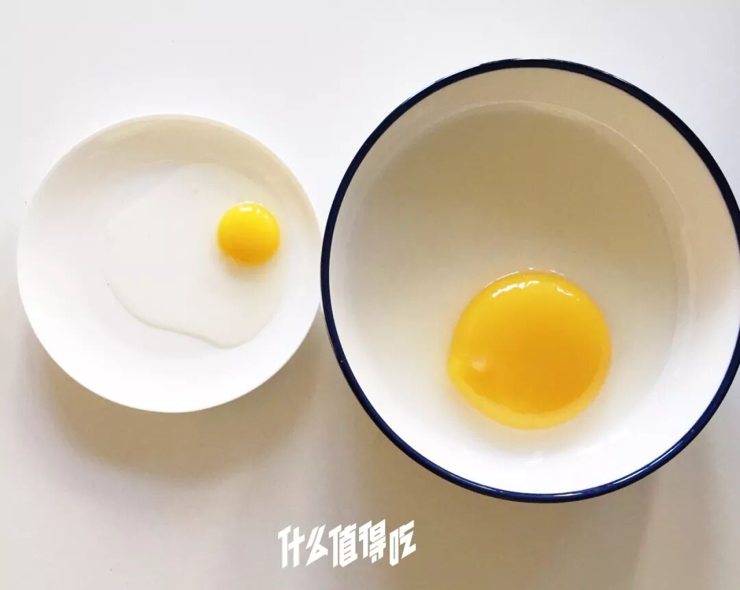 新鲜鸡蛋的蛋黄、蛋清分明,蛋黄聚合、饱满、明亮,蛋白透亮、有稠度。