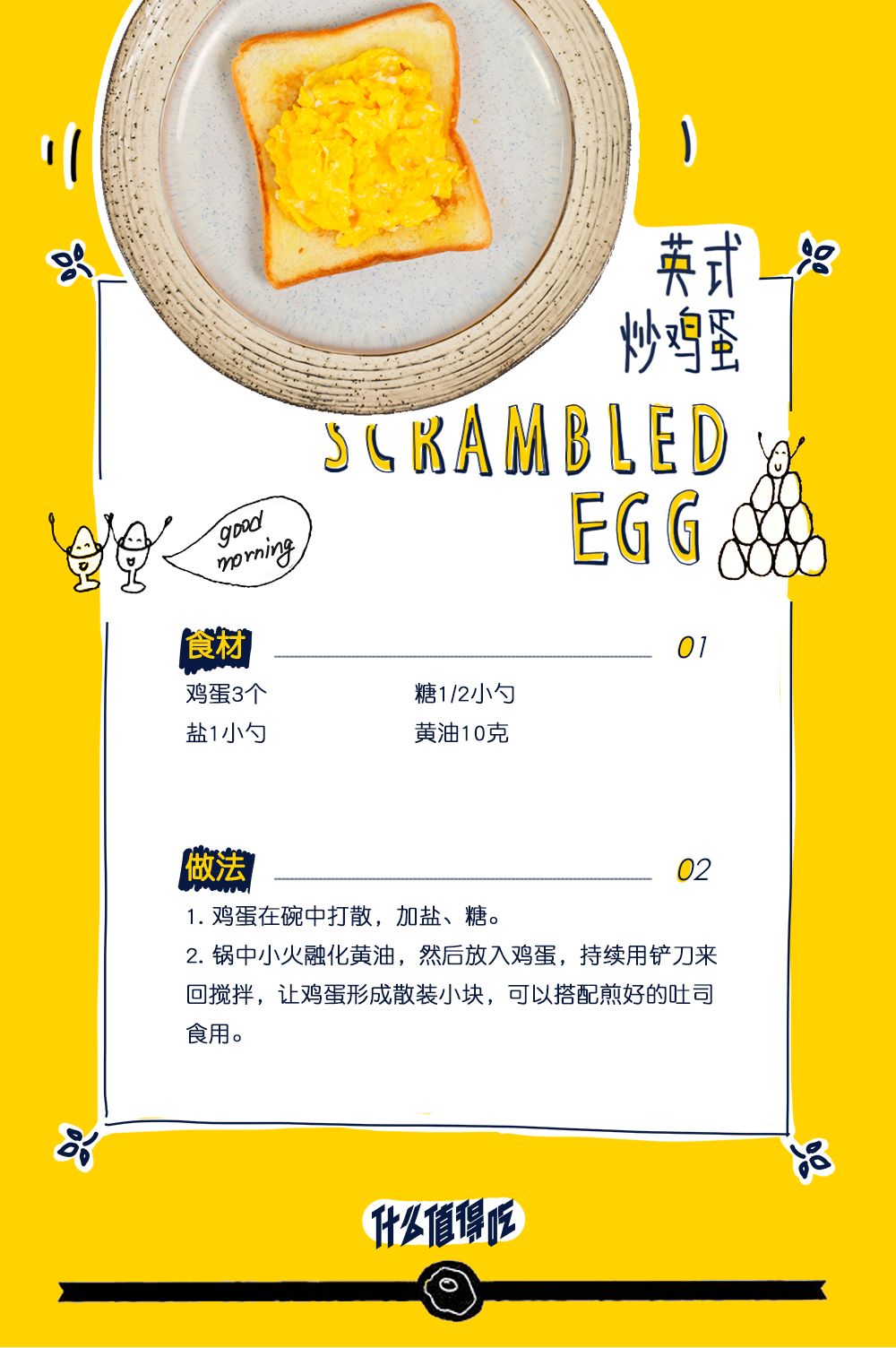 英式炒鸡蛋很嫩滑,这是因为翻动开始得比中式炒鸡蛋要早,而且更勤。当然,也因为放了不少黄油。这种做法以糖、盐调味均可。