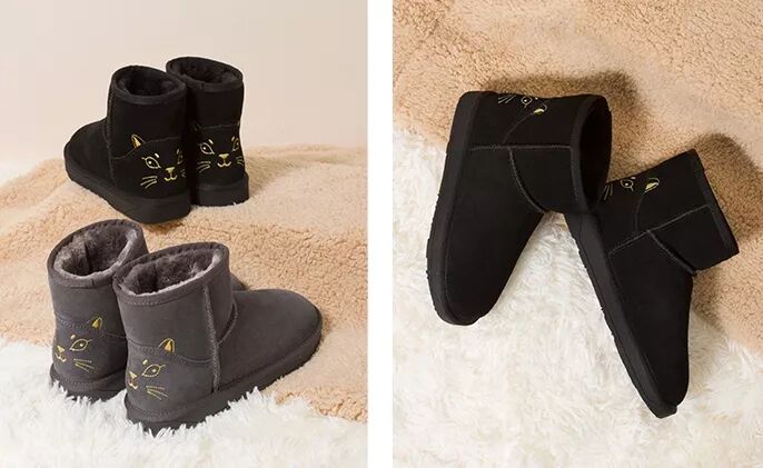 今年的一款萌喵治愈系设计适意出众,将喵星人运用到雪地靴上,顿时让你轻松进阶时尚萌,好喜欢这款设计,今年必买啊!