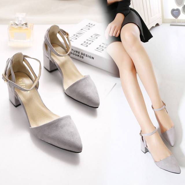 2017夏季玛丽珍鞋韩版简约一字扣绒面尖头中跟真皮镂空女粗跟单鞋