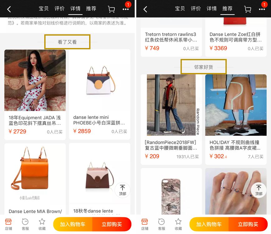 每个商品详情页的底部,会有「看了又看」,意思是跟你一样看过这个商品的人还看了这家店铺的哪些单品,相当于是淘宝试图在给你推荐一些跟你口味相似的人的偏好单品