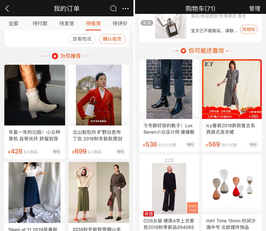 在「我的订单」的待发货、待收货、待评价的最后,都会有一个「为你推荐」