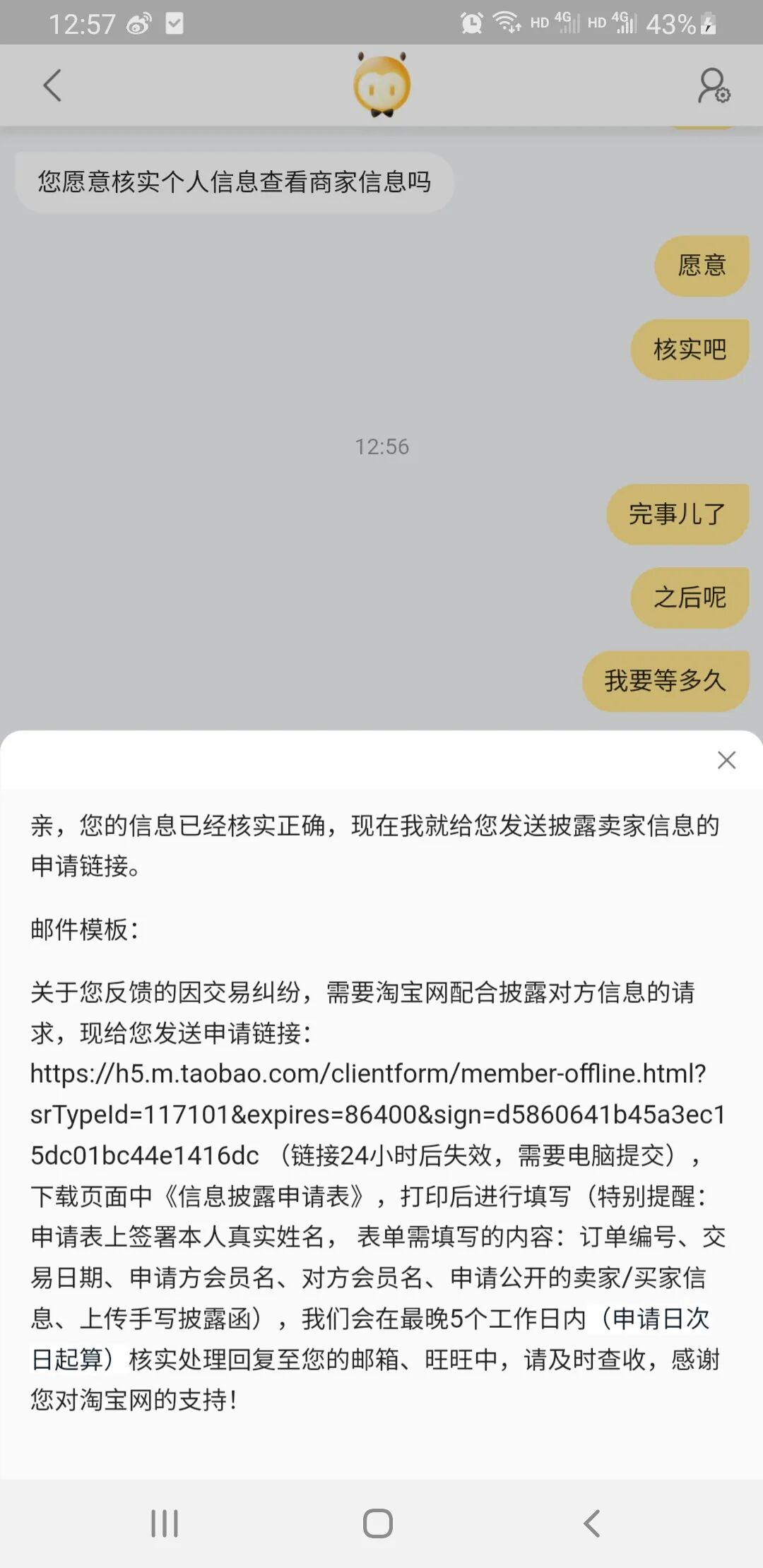 想知道商家真实信息,要以法院起诉为由,找淘小蜜申请商家信息纰漏,这时候他们会给你一个链接,如图。