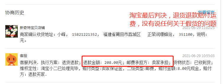 上文中我说过,我提供了有理有据的证据,等了三天卖家举证,结果卖家不举证,淘宝自动帮我申请了退货退款。所以千万不要等卖家举证!千万别等!随后我再次申请客服介入,升级处理,淘宝方电话联系认为我证据不足。但是商家只是口述三个字:是正品,淘宝就屁颠屁颠走过来告诉我是正品了。并且仅仅给我申请了运费险,剩下的运费冻结了商家20元也由商家承担。
