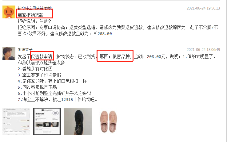 我一开始善心大发,没想假一赔三,也是怕麻烦投诉举报,寻思假鞋我就不退了,把钱还我就行。结果商家一口咬死了我要白嫖他家的鞋,说话态度特别恶劣不友善,并且完全不跟你聊关于产品真假的问题。