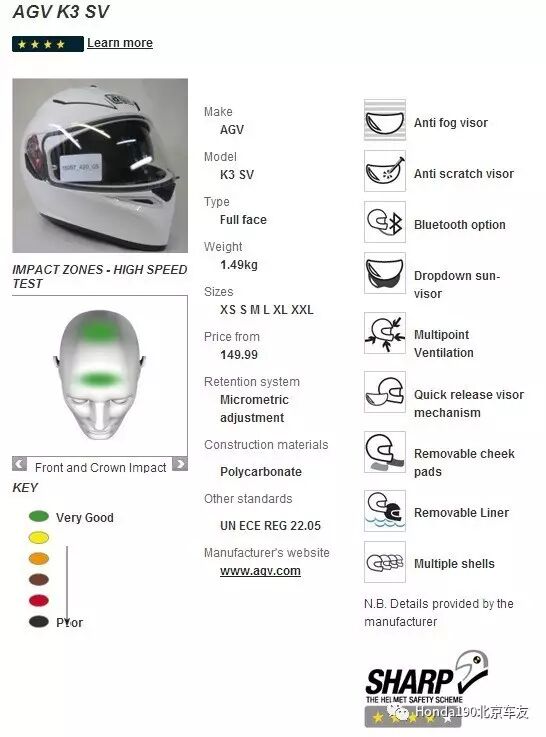 以我们常见的两款头盔为例,一是市价3000+的Shoei GT-air(SHARP 3星),一是市价1800+的AGV K3 SV(SHARP 4星),便宜的AGV反倒比Shoei更安全,现在大家知道怎么找到性价比高又安全的头盔了吧?