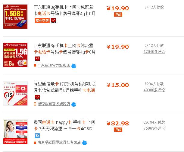 广参小编登录淘宝网输入手机卡等关键词发现,得到的搜索结果中多数均为天猫网商家。没有天猫标识的电话卡售卖商家,结果显示多为泰国电话卡等,未见到境内相关产品。