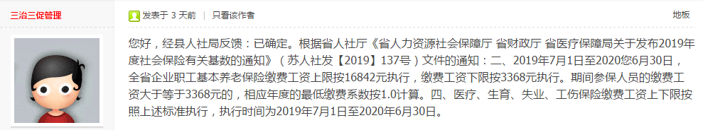三治三促管理:您好,经县人社局反馈:已确定。根据省人社厅《省人力资源社会保障厅 省财政厅 省医疗保障局关于发布2019年度社会保险有关基数的通知》(苏人社发【2019】137号)文件的通知:二、2019年7月1日至2020您6月30日,全省企业职工基本养老保险缴费工资上限按16842元执行,缴费工资下限按3368元执行。期间参保人员的缴费工资大于等于3368元的,相应年度的最低缴费系数按1.0计算。四、医疗、生育、失业、工伤保险缴费工资上下限按照上述标准执行,执行时间为2019年7月1日至2020年6月30日。