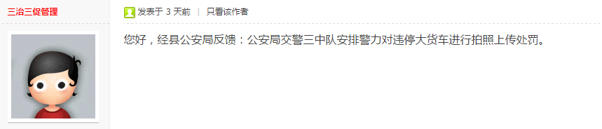 三治三促管理:您好,经县公安局反馈:公安局交警三中队安排警力对违停大货车进行拍照上传处罚。