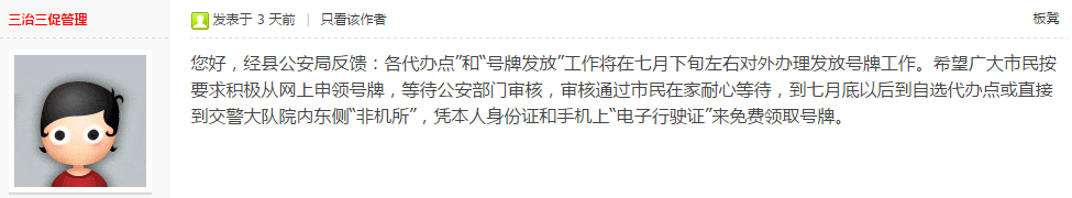 三治三促管理:您好,经县公安局反馈:各代办点和号牌发放工作将在七月下旬左右对外办理发放号牌工作。希望广大市民按要求积极从网上申领号牌,等待公安部门审核,审核通过市民在家耐心等待,到七月底以后到自选代办点或直接到交警大队院内东侧非机所,凭本人身份证和手机上电子行驶证来免费领取号牌。