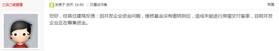 三治三促管理:您好,经县住建局反馈:因开发企业资金问题,维修基金没有缴纳到位,造成未能进行房屋交付备案,目前开发企业正在筹集资金。