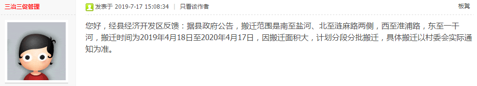 三治三促管理:您好,经县经济开发区反馈:据县政府公告,搬迁范围是南至盐河、北至涟麻路两侧,西至淮浦路,东至一干河,搬迁时间为2019年4月18日至2020年4月17日,因搬迁面积大,计划分段分批搬迁,具体搬迁以村委会实际通知为准。